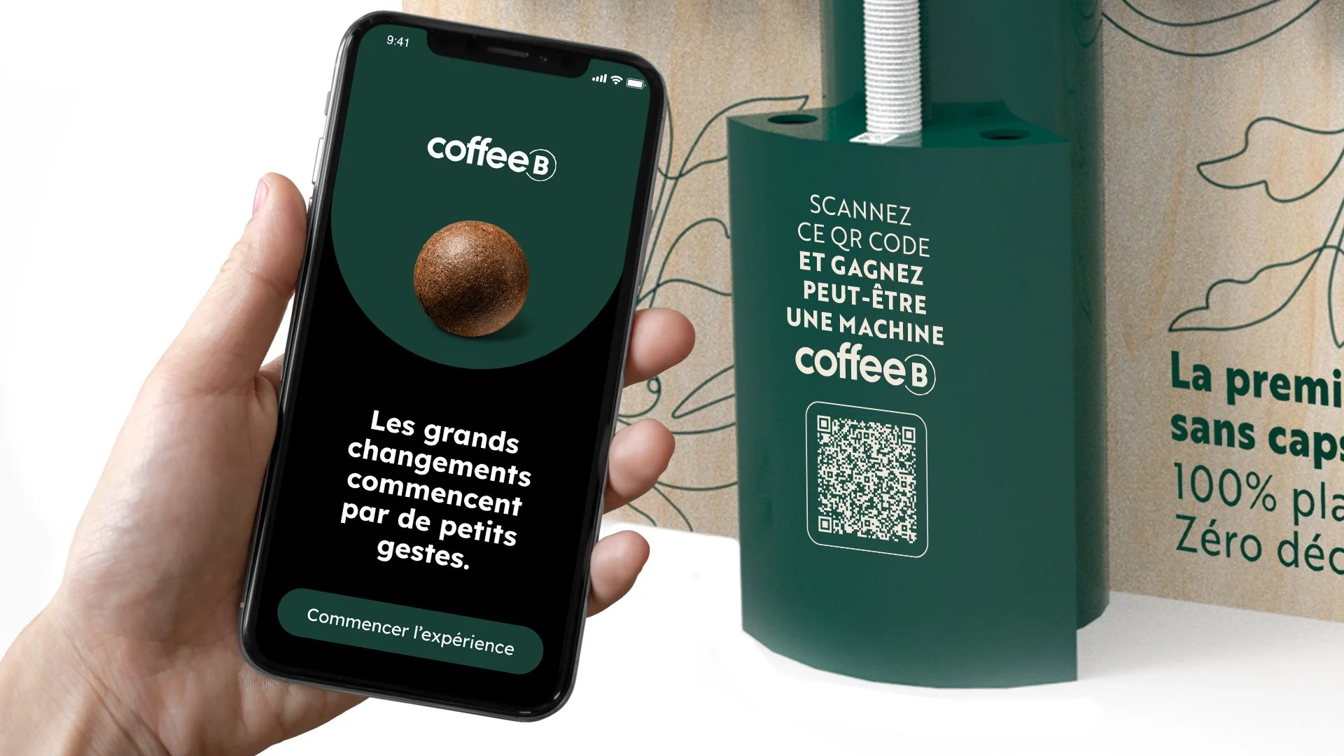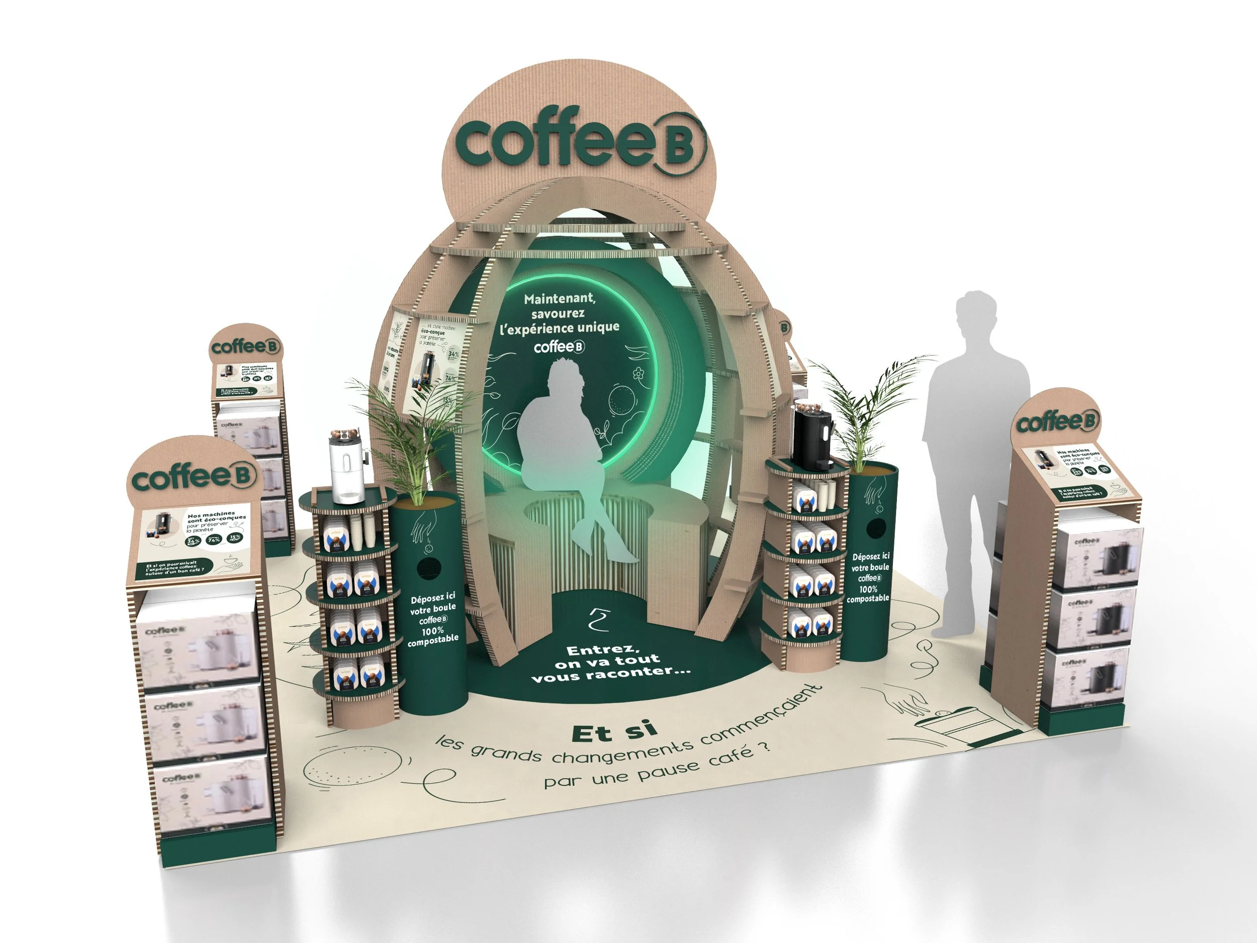 CoffeeB : Expérience phygital instore.Un stand low tech de forme circulaire, avec douche sonore,pour raconter l’innovation CoffeeB.